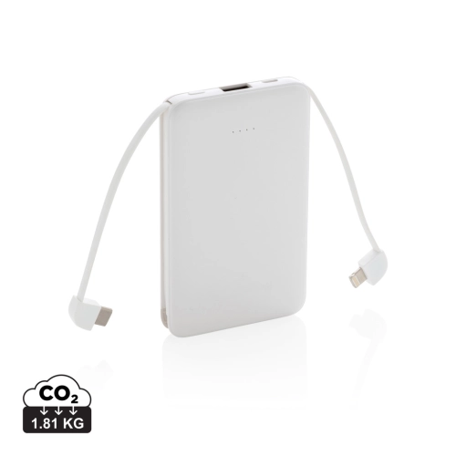 Compact and flat 5.000 mAh powerbank made out of ABS that is easy to take with you wherever you go. With the 3 in 1 integrated TPE cables the powerbank is compatible with all mobile devices in the market and directly ready for use. When fully charged it will provide you with enough energy to re-charge your mobile phone up to two times. The powerbank contains a long lasting grade A 5000 mAh high-density lithium polymer battery. The power indicators will indicate the remaining energy level so you always know when to re-charge. Input: 5V/2A Output 5V/2A.