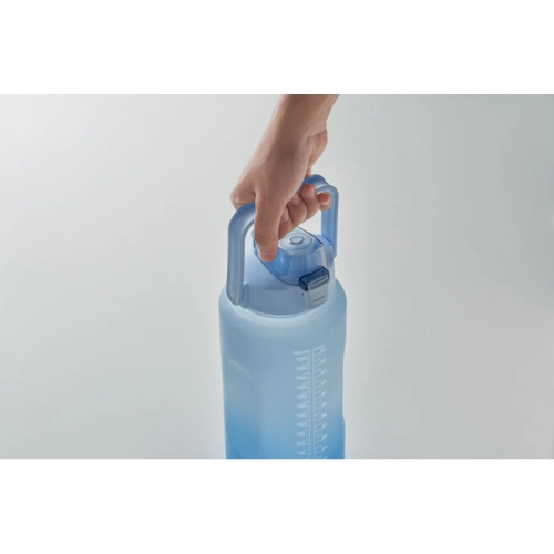 Motivational water bottle in RPET. Features a one-hand open flip-top lid with straw, safety lock, and handle. Leak-free. Capacity : 2000 ml