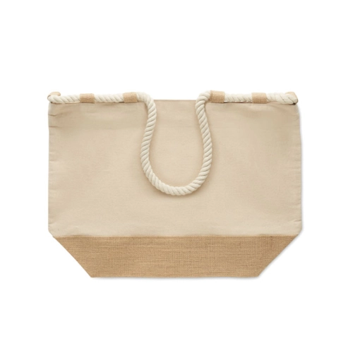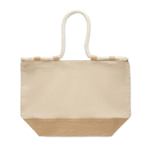 Beach bag in 280 gr/m² cotton canvas and jute with cord handles. Features zipper closure, jute-covered bottom and 10 jute loops.