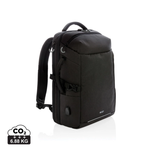 This carry-on travel backpack is intended for overnight or weekend trips. It is designed with a padded 17" laptop compartment to protect your device. This style has the capacity of a trolley without the weight of the wheels and handle, plus using a backpack makes you more mobile, hands-free and simplifies your travel experience. Leave your wheels at home and travel easily. Including trolley strap, water bottle side pocket and USB A output. Top quick access pocket, front zippered pocket and RFID protected pockets. With AWARE™ tracer that validates the genuine use of recycled materials. Each bag has reused 35.5 0.5L PET bottles. 2% of proceeds of each Impact product sold will be donated to Water.org. PVC free.