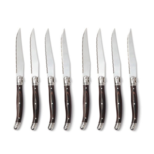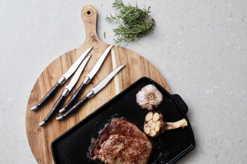 High-quality meat knives in typical French-inspired bistro style. Black pakka wood handle and high-quality stainless steel blades. The blade has a fine grating that allows you to cut through food with as little resistance as possible. A set of four knives which you can easily match with your forks at home. Packed in an exclusive gift box.